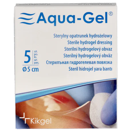 Opatrunek hydrożelowy Aqua-Gel to innowacyjne rozwiązanie w leczeniu różnego rodzaju ran. Dzięki zastosowaniu naturalnych i syntetycznych polimerów usieciowanych za pomocą wiązek elektronów, ten sterylny opatrunek zapewnia optymalne warunki gojenia się rany. Dostępny w rozmiarach średnicy 5 cm i 6,5 cm oraz pakowany po 5 sztuk w opakowaniu, Aqua-Gel charakteryzuje się grubością około 3,5 mm, przy możliwości wahania się grubości w granicach 0,5 mm. Głównym składnikiem opatrunku jest woda, stanowiąca aż 90% jego składu, co pozwala na utrzymanie odpowiedniego poziomu nawodnienia tkanek i łagodzi ból.