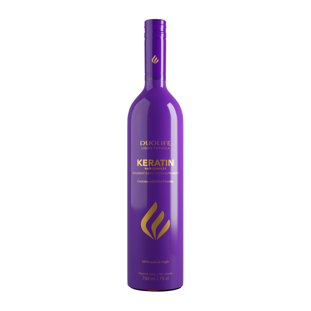 DUOLIFE Keratin Hair Complex – to suplement diety w płynie skomponowany ze starannie wyselekcjonowanych składników pochodzenia naturalnego, które tworzą unikalną kompozycję, zgodną z zasadami synergizmu. Produkt DUOLIFE Keratin Hair Complex to połączenie soków owocowych, formuły ekstraktu z czarnego ryżu i kwiatów opuncji figowej, keratyny solubilizowanej, ekstraktu z organicznych pędów grochu oraz wielu innych cennych ekstraktów roślinnych.